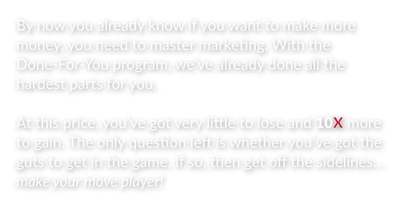 Funnels, emails, reports, ads, contracts, scripts, rebuttals, sales videos... hiring someone would cost a small fortune. They're all inside the 10X Marketing Done-for-You program!